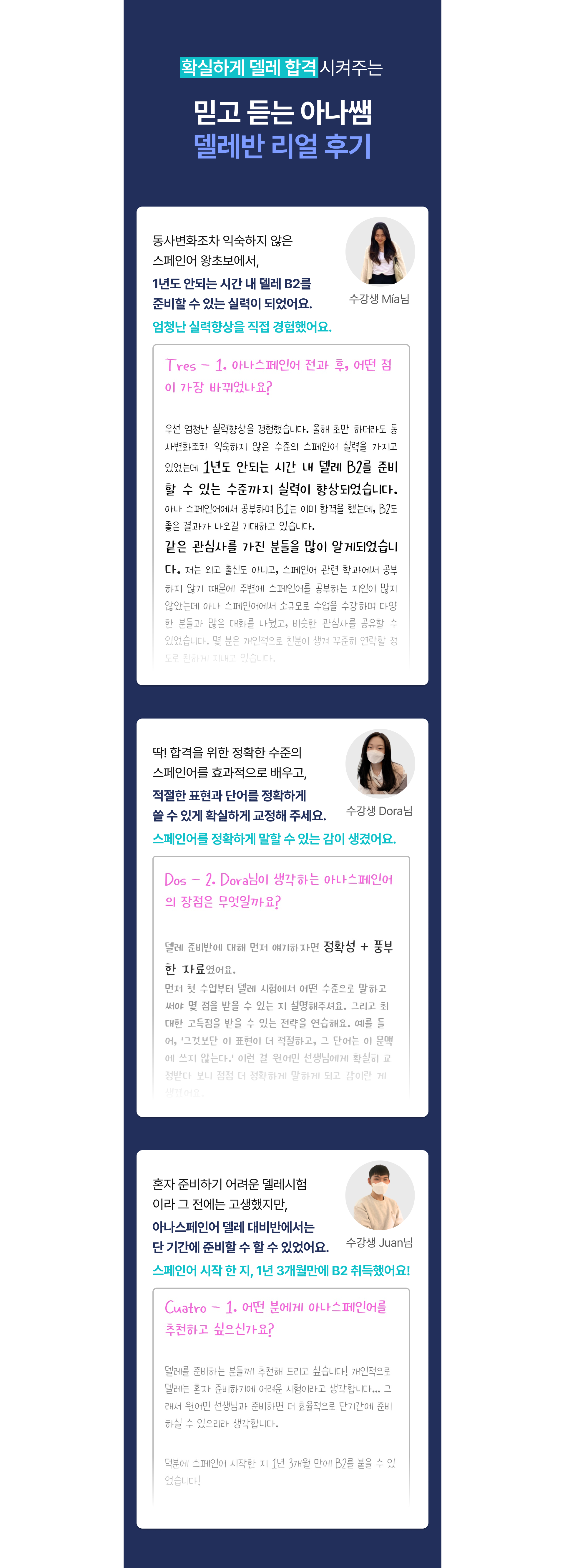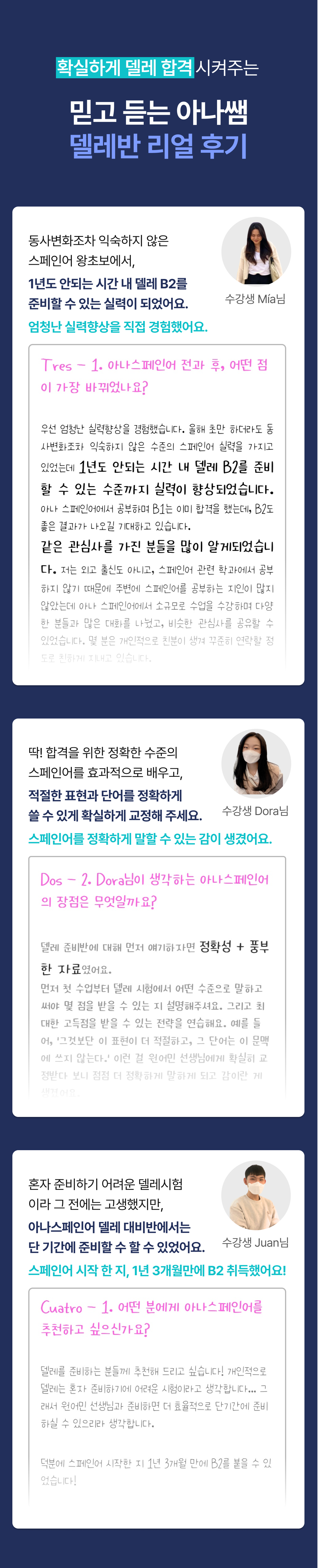 "1년만에 델레 B2를 목표로 달리게 해준 아나스페인어!" - 수강생 Mia님 -